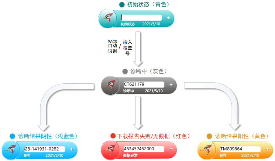 根據(jù)不同的診斷結果,“小啄”將呈現(xiàn)出不同的顏色,同時,在“小啄”中間的輸入框下方顯示對應的文字提示(診斷狀態(tài)、診斷日期),如下圖所示。