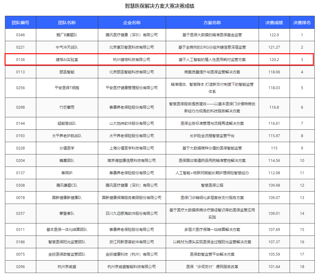 3月3日,國(guó)家醫(yī)保局智慧醫(yī)保解決方案大賽決賽成績(jī)正式對(duì)外公布, 健培AI實(shí)驗(yàn)室《基于人工智能的植入性醫(yī)用耗材監(jiān)管方案》以120.2分的成績(jī)位列前三,榮獲一等獎(jiǎng)。 此次比賽是國(guó)家醫(yī)保局貫徹落實(shí)黨中央“關(guān)于高度重視新一代信息技術(shù)在醫(yī)藥衛(wèi)生領(lǐng)域的應(yīng)用”要求的具體舉措,歷時(shí)近5個(gè)月,騰訊、阿里、百度、平安、泰康等133家企業(yè)的156個(gè)團(tuán)隊(duì)參與本次大賽,最終有18個(gè)方案入圍決賽。