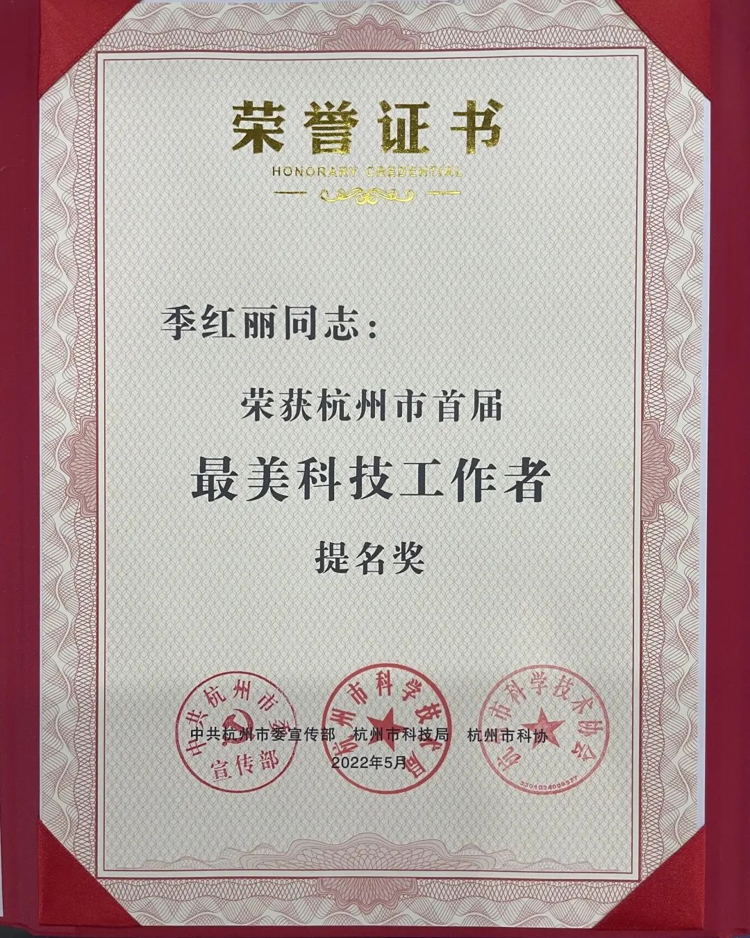 喜訊:季紅麗博士榮獲杭州市“最美科技工作者”提名