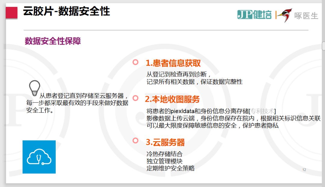 健培科技蘭小金介紹到,健培采用獨(dú)有的圖像和信息分離技術(shù)最大限度保障了患者信息的安全。從患者登記直到存儲至云服務(wù)器,每一步都采取最有效的手段來做好數(shù)據(jù)安全工作。健培獨(dú)有的piexldata和身份信息分離存儲技術(shù),可以使影像數(shù)據(jù)上傳云端,身份信息保存在院內(nèi),以最大限度保障敏感信息的安全、保護(hù)患者隱私。