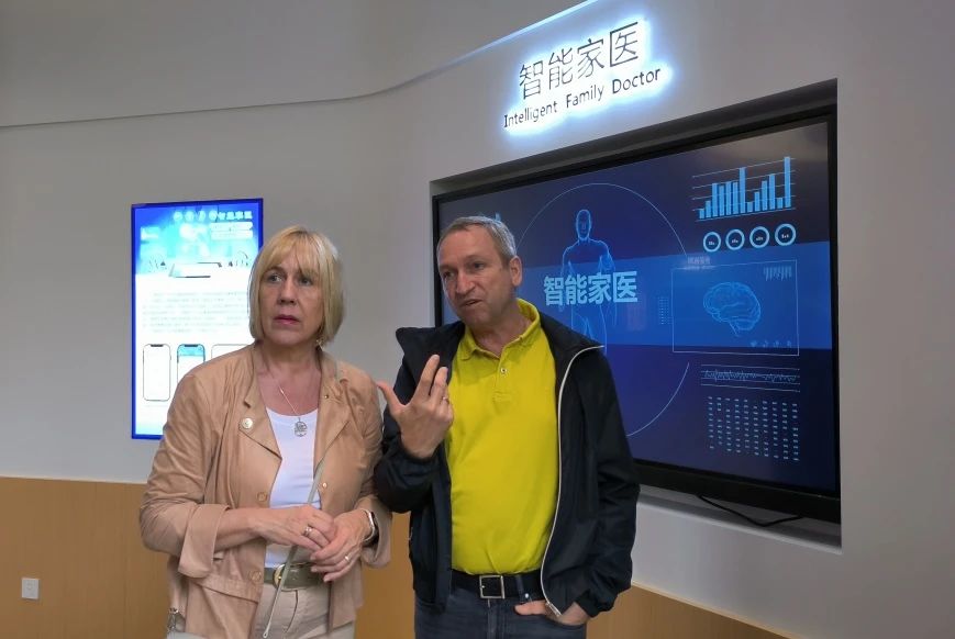 參觀考察過(guò)程中,沈院長(zhǎng)詳細(xì)介紹了在烏鎮(zhèn)智能醫(yī)院中,“啄醫(yī)生”是如何賦能基層醫(yī)療場(chǎng)景應(yīng)用的。沈院長(zhǎng)表示,烏鎮(zhèn)智能醫(yī)院憑借著“啄醫(yī)生”醫(yī)療大模型技術(shù)所賦予的出色交互能力和多學(xué)科融合理解力,實(shí)現(xiàn)了社區(qū)首診、智能轉(zhuǎn)診、個(gè)性化康復(fù)的全鏈條智能化管理,有效連接了醫(yī)養(yǎng)結(jié)合的“15分鐘”生活圈。Roland Eils院士對(duì)烏鎮(zhèn)智能醫(yī)院所展現(xiàn)出的創(chuàng)新實(shí)踐給予了高度評(píng)價(jià),特別是其作為國(guó)內(nèi)首個(gè)實(shí)現(xiàn)全流程人工智能服務(wù)的醫(yī)康養(yǎng)一體化社區(qū)醫(yī)院,展現(xiàn)出的前瞻性技術(shù)布局和卓越的醫(yī)療服務(wù)能力。專家們還親身體驗(yàn)了其中的一些應(yīng)用場(chǎng)景,并對(duì)智能問(wèn)診、慢病管理、可穿戴設(shè)備等進(jìn)行了深入了解。通過(guò)本次考察交流,不僅為中外學(xué)術(shù)交流建立了優(yōu)質(zhì)的溝通渠道,同時(shí)也為將來(lái)更多更深層次的國(guó)際合作奠定了良好的基礎(chǔ)。