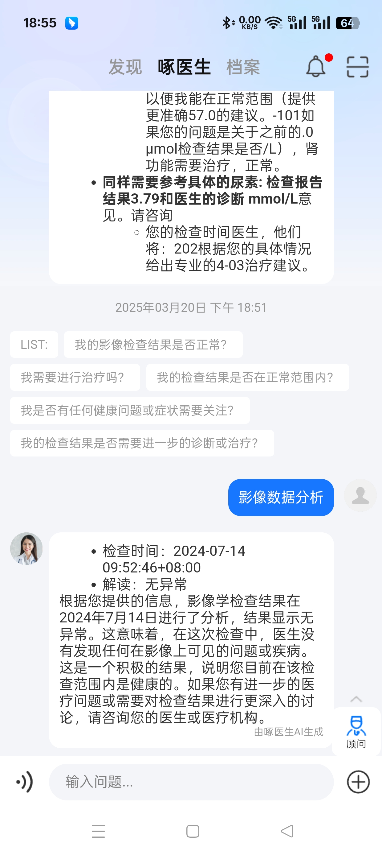 啄醫(yī)生具備患者AI智能咨詢功能?;颊呷绻麑?duì)報(bào)告產(chǎn)生疑惑,便可進(jìn)行對(duì)話咨詢。能結(jié)合患者當(dāng)前影像報(bào)告,患者再口語(yǔ)化描述其他體感癥狀,幫助患者分析自身病情,可以引導(dǎo)完成必要復(fù)查隨訪,讓患者輕松理解。就像和一位貼心的醫(yī)生朋友聊天一樣自然,為患者帶來(lái)了全新的就醫(yī)體驗(yàn),極大地提升了患者的就醫(yī)主動(dòng)性和健康管理意識(shí)。