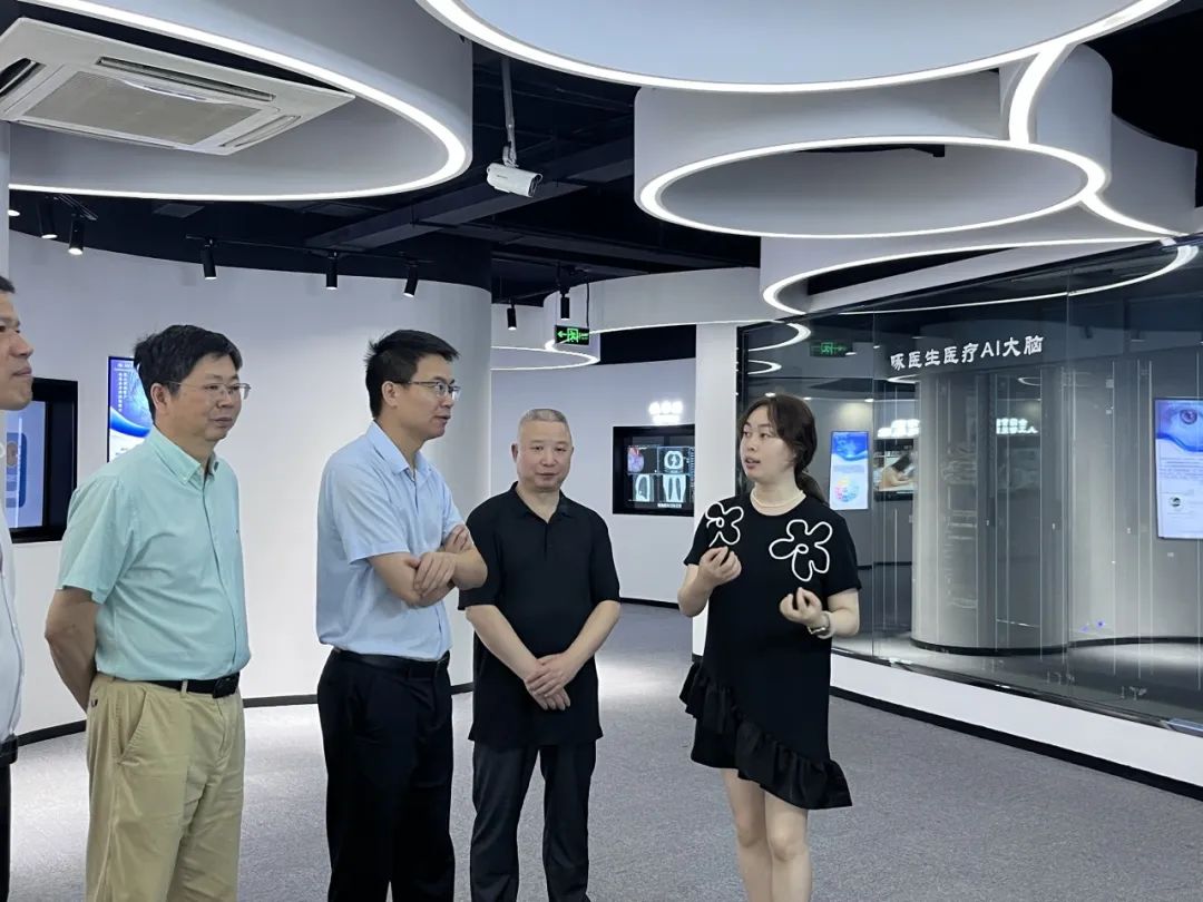 健培科技副總裁徐招海帶領(lǐng)領(lǐng)導(dǎo)們親身體驗了“啄醫(yī)生AI診室”的一些特色項目,并匯報公司產(chǎn)品研發(fā)歷程、以及近年來利用AI技術(shù)在早期篩查、輔助診斷、輔助治療等方面的相關(guān)探索和成績。在參觀過程中雙方交流了兩地科技創(chuàng)新的經(jīng)驗和做法,領(lǐng)導(dǎo)們對健培持續(xù)發(fā)揮科技創(chuàng)新引領(lǐng)作用,以及科技成果轉(zhuǎn)化的成績表示祝賀,希望健培再接再厲,充分利用啄醫(yī)生醫(yī)療大模型等AI技術(shù),更好地發(fā)揮科技對醫(yī)療以及公共衛(wèi)生健康事業(yè)發(fā)展的支撐引領(lǐng)作用。