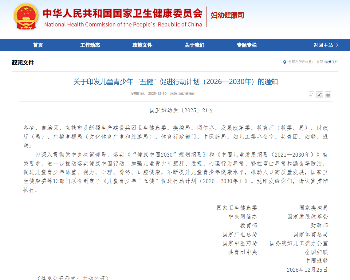 近日,為深入貫徹黨中央決策部署,落實(shí)《“健康中國2030”規(guī)劃綱要》和《中國兒童發(fā)展綱要(2021?2030年)》有關(guān)要求,進(jìn)一步推動(dòng)落實(shí)健康中國行動(dòng),加強(qiáng)兒童青少年肥胖、近視、心理行為異常、脊柱彎曲異常和齲齒等防治,促進(jìn)兒童青少年體重、視力、心理、骨骼、口腔健康,不斷提升兒童青少年健康水平,推動(dòng)人口高質(zhì)量發(fā)展, 國家衛(wèi)生健康委等13部門聯(lián)合制定了《兒童青少年“五健”促進(jìn)行動(dòng)計(jì)劃(2026?2030年)》 。